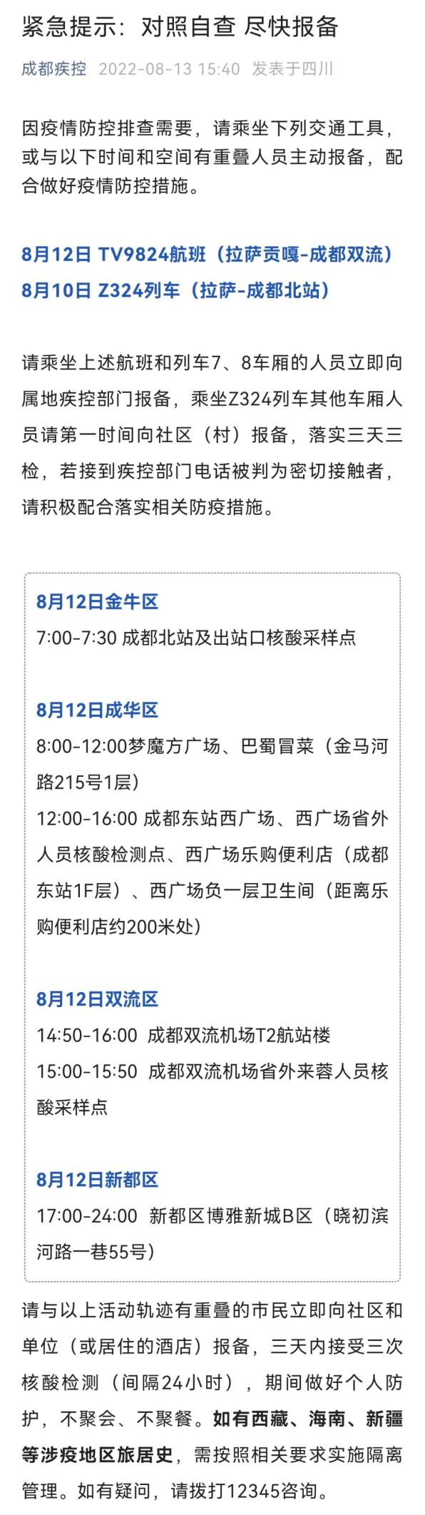 成都疾控13日紧急提示:请乘坐下列交通工具,或与以下时间和空间有重叠人员主动报备,配合做好疫情防控措施。