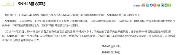 针对日方的除名声明,SNH48发表声明称双方只存在技术合作,不存在违规行为。但随着粉丝经济这块蛋糕越来越大,SNH48在没有经过授权的情况下在各地开设了分团,如篇首提到的,这导致了国内其他偶像团体的危机,也激怒了日本方面。2016年6月,日本官方宣布将SNH48从日本的48 Group中除名,随即SNH48也也发布声明,称和AKB48仅仅存在技术合作,并不存在违规行为,宣布彻底从48Group中独立。