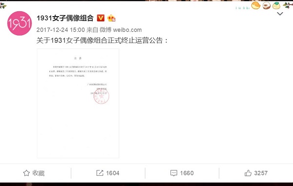 国内女子偶像团体1931终究还是没能撑到2018年,2017年12月24日,团体通过其官方微博账号宣布解散。