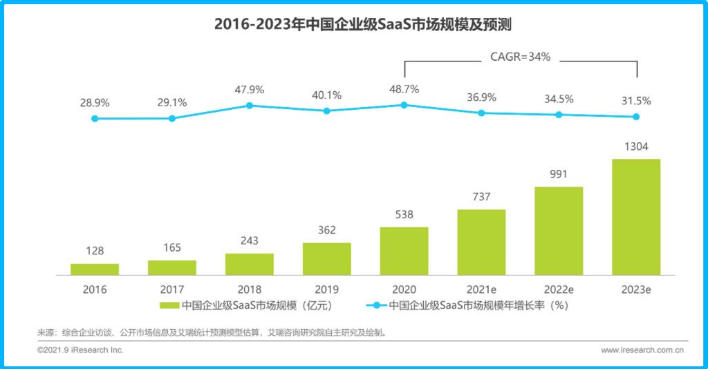 尽管艾瑞咨询报告显示,2020年中国SaaS市场规模达到了538亿元,预计未来三年(2021-2023年)会保持34%的复合增长率,到2023年总规模突破千亿大关。
