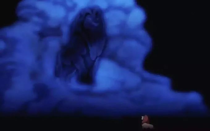 但当青年辛巴失去一切、挣扎于是否要放弃责任时,他看到自己在河中的倒影幻化成了父亲的面庞。随即风云汇聚,父亲的魂魄出现在空中,告诫他记住自己的身份,从内心深处寻找力量。他问旁人有没有和他一样看到父亲,对方说没有。这里始终只有他自己而已。