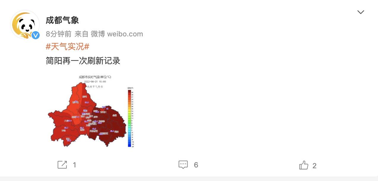 截至今天(8月21日)15时,成都最高气温达到了43.4°C,出现在简阳市,这也是成都有气象记录以来的最高气温。