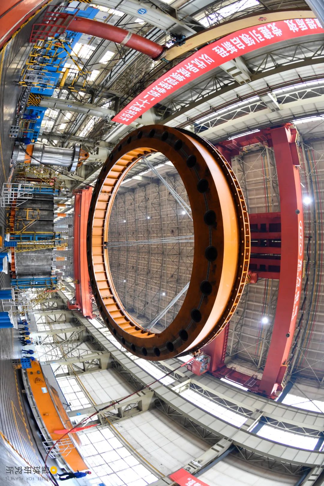 请横屏观看,葛洲坝改造项目1号机导水结构吊装顶盖。2021年,葛洲坝电站两台单机容量170兆瓦,运行近40年的水轮发电机组迎来改造,时隔四十年,东方电机与葛洲坝再次联动 | 图片来源@东方电气集团东方电机有限公司