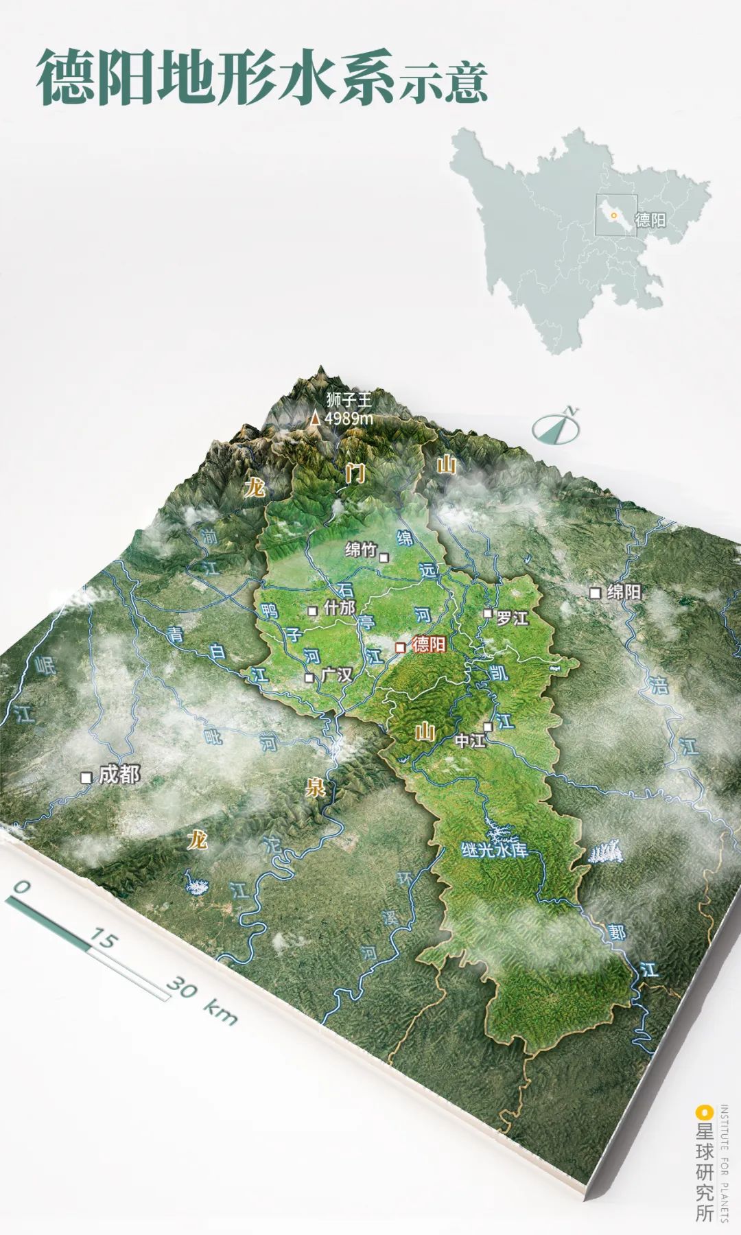 德阳区划地形水系示意。市内五条大河为绵远河、石亭江、鸭子河、青白江和凯江 | 制图@陈志浩/星球研究所