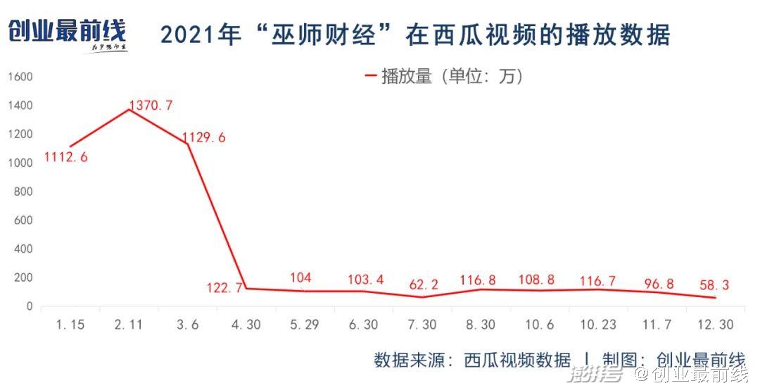 在内容产出下降的同时,流量也不乐观,在西瓜视频,“巫师财经”视频的播放量经历了一个猛涨到猛降的过程。相较于2021年2月最顶峰时的1270万,4月30日当期即一路滑到122.6万,而从5月到12月,播放量一直在百万和几十万量级。