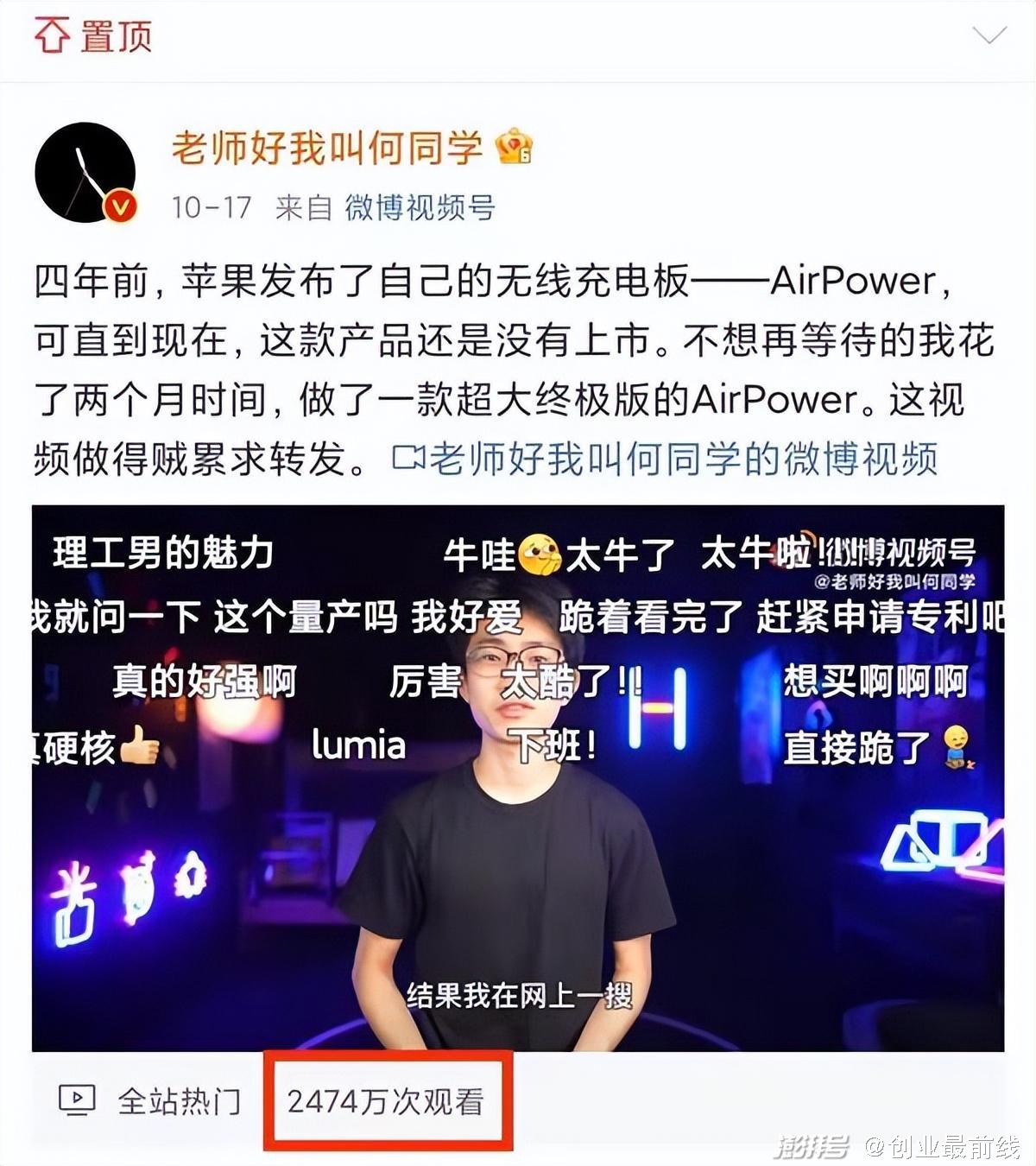 在每个行业里,“顶流”基本都有自己的一套方法论。如曾经备受B站宠爱的“何同学”,因为B站控制成本大幅降低视频广告分成,不得不成立工作室单飞,同时,将视频内容分发到微博等其他平台,并且多次登上微博热搜。以何同学于2021年10月17日发布的《我做了苹果放弃的产品……》为例,该视频同时在微博和B站发布,话题词#何同学 Airpower#很快登上微博热搜,3天时间,微博播放量接近2500万次,B站播放量超过800万次,成功实现破圈。