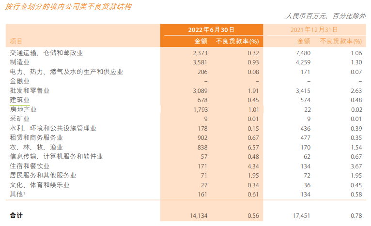按行业划分的境内公司类不良贷款结构来看,截至2022年6月末,房地产业占的不良贷款余额为17.93亿元,不良贷款率为1.01%。