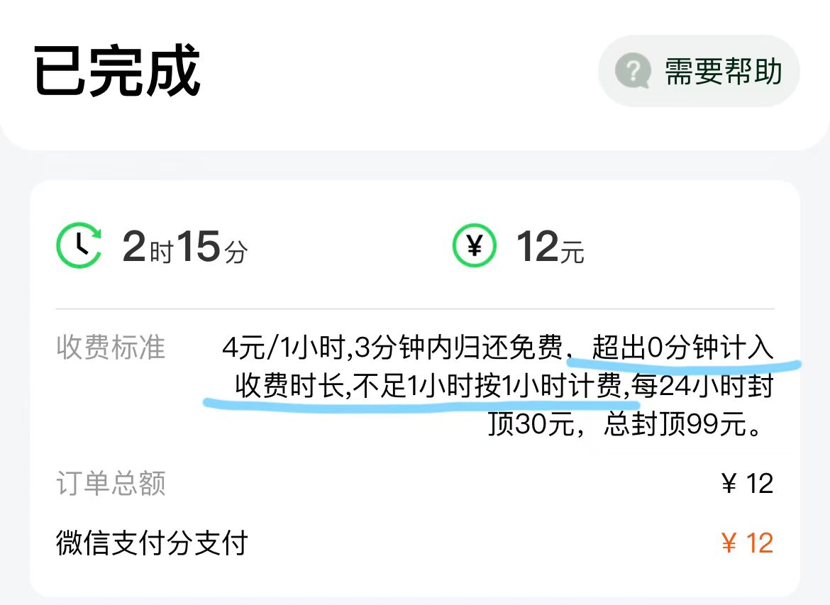 该消费者告诉记者,巧合的是,她在2019年使用过同一家共享充电宝品牌的充电宝,时间同样是2小时15分钟,收费是10元。“每小时收费的标准是一样的,不同的是,2019年的收费规则是超出5分钟计入收费时长,不足30分钟按30分钟计算。现在的规则是,超出0分钟就计入收费,按1小时的价格来收。”
