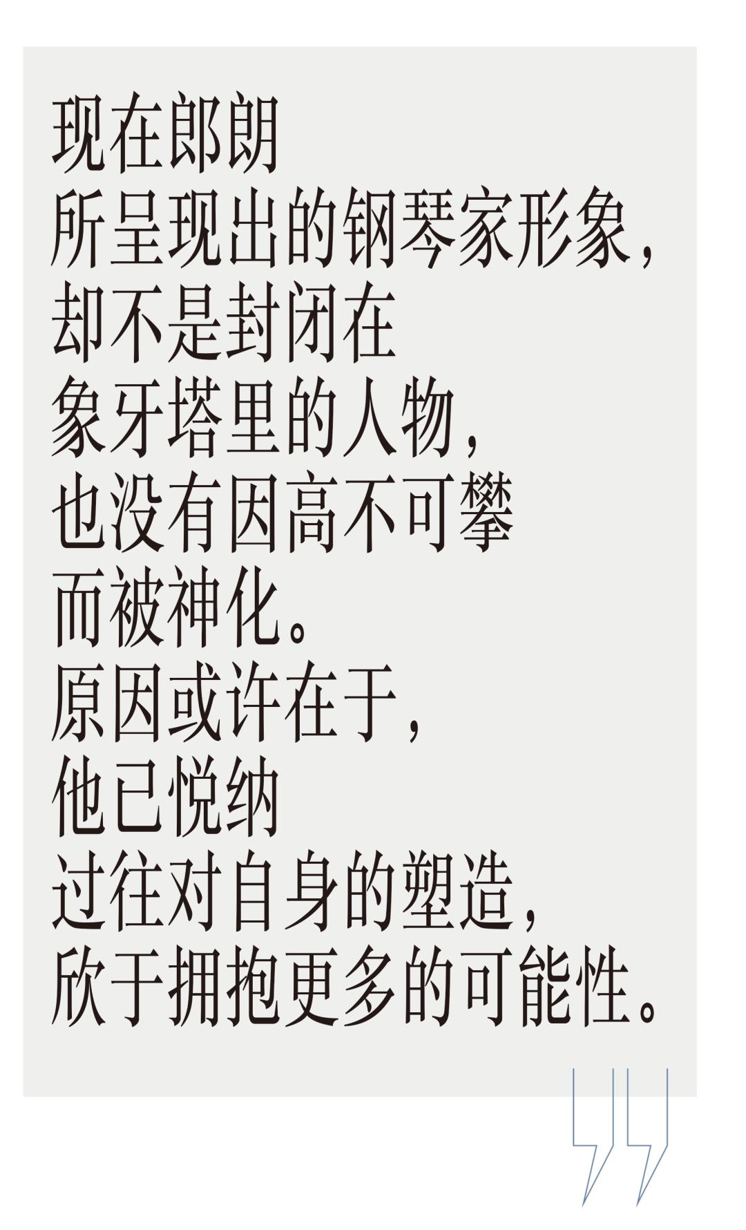 网上流行着“一万小时定律”,称任何人在某事上付出一万小时,就能成为该领域的专家。现在郎朗所呈现出的钢琴家形象,却不是封闭在象牙塔里的人物,也没有因高不可攀而被神化。原因或许在于,他已悦纳过往对自身的塑造,欣于拥抱更多的可能性。