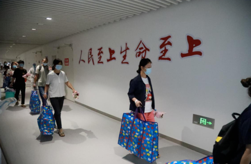 当天中午,在医务人员的帮助下,患者们收拾好个人物品,拿着医院统一发放的手提袋,完成出院前的消杀后,手持方舱医院发放的“抗疫证明”有序离开。上大巴车前,白衣天使们更是送上了一束束鲜花表示祝贺。