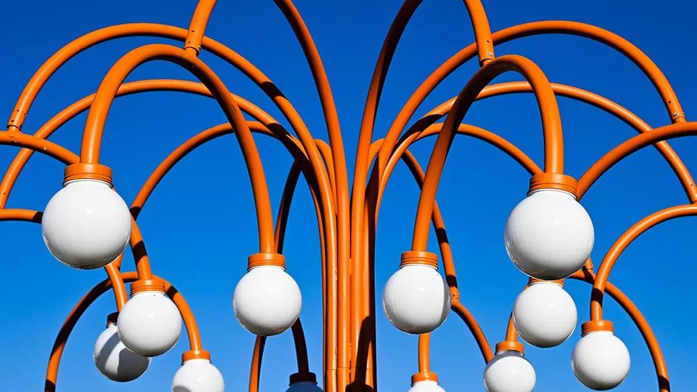 橘色装置灯在蓝天的映衬下显得格外鲜艳,我在拍摄时觉得它张牙舞爪的样子很可爱。其实我们不需要拍一整个装置灯,只需要把灯头这些线条平均分配到画面里即可。