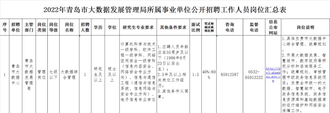 近日,2022年青岛市大数据发展管理局所属事业单位青岛市大数据中心面向社会公开招聘工作人员1名。