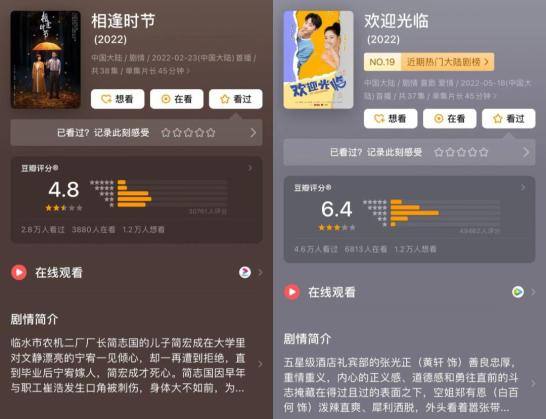 翻看正午阳光的都市剧,除了《欢乐颂》,有不乏创造出苏大强这一经典人物,并创造出风靡全网的梗的《都挺好》;有率先进行12集短剧尝试的《我是余欢水》;也有讲述中年危机、共化世仇矛盾的《相逢时节》和带有轻喜风格的《欢迎光临》等等。只是,相比起正午阳光在其他类型上的佳作频出,正午阳光在都市剧上的发挥却并不稳定,尤其是今年接连上线的《相逢时节》和《欢迎光临》,分别拿下豆瓣4.8和6.4的分数,让质疑的情绪逐渐累积,再加上在开年《开端》的全网爆火和豆瓣7.8分的映衬下,同打着正午阳光出品的名号,正午阳光在都市剧的乏力更加凸显。