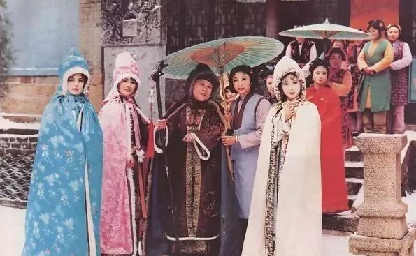 下回,宝琴写的梅花诗里有一句话“春装儿女竞奢华”,烟花三月,春服既成,女儿们穿上浅粉、嫩绿、水红、杏黄的衫子,行走在扑面而来的春风里,自是乱花迷人眼。然而这个白雪覆盖的冬日,七八件大红羽纱或猩猩毡质地的斗篷营造出来的奢华景象,更有视觉冲击力,以致于几个没有穿大红斗篷的姑娘奶奶,在人群里分外显眼。她们是宝琴、湘云、李纨、宝钗、岫烟。
