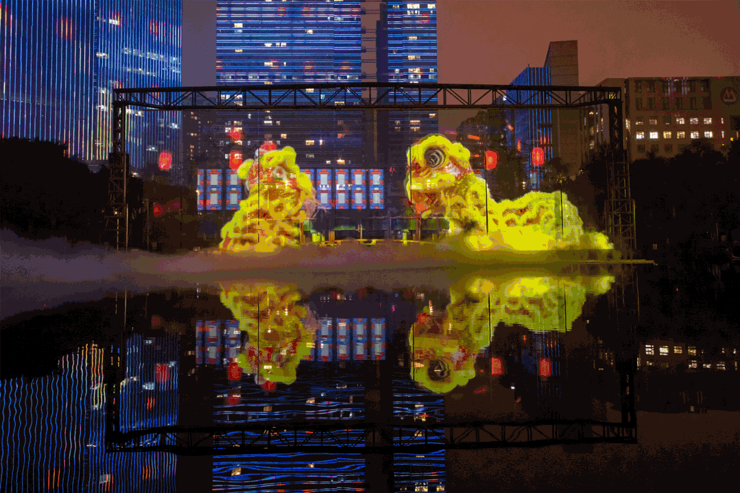 楼宇化身巨型荧幕,湖面升起中央水幕屏,光影交织的3d全息投影《千灯谣》,闪耀千灯湖的夜空。