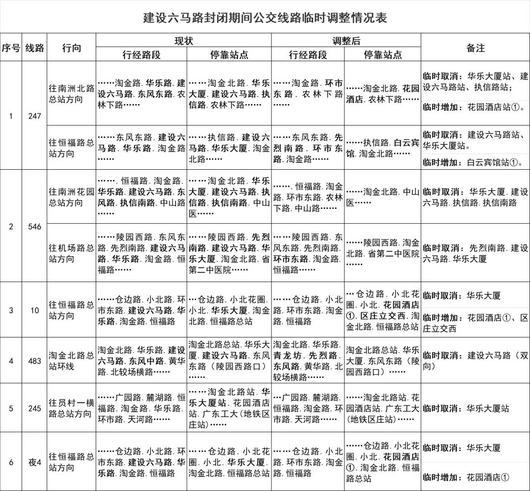 一、临时调整公共汽车10、245、247、483、546、夜4路等线路临时取消行经华乐路、建设六马路,临时绕行环市东路、东风路等路段后接回原线运行。临时撤销公共汽车建设六马路站(双向),上述线路临时取消停靠公共汽车建设六马路站、华乐大厦站、执信路站等站点,临时增加停靠公共汽车花园酒店站、白云宾馆站等站点。