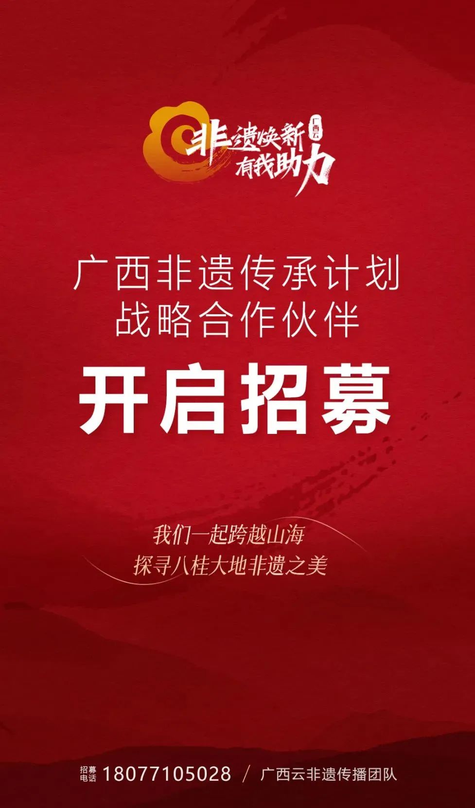 为了让更多的非遗被看见、被保护、被喜爱、被传承,广西云非遗传播团队现面向全社会招募非遗焕新助力战略合作伙伴,诚邀您同我们携手前行,在非遗内容推广、活动运营、电商推广、产业开发等方面紧密合作,为广西非遗保护和传承注入全新活力!