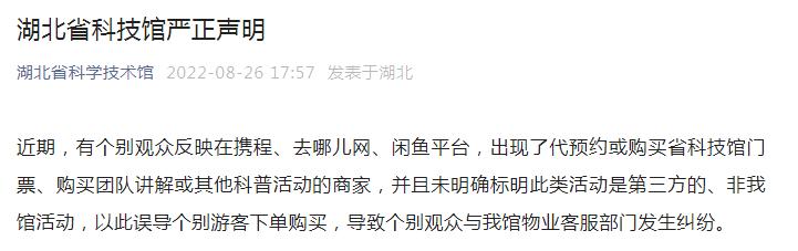 8月26日,湖北省科技馆发布一则严正声明,全文如下: