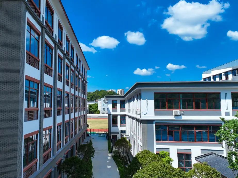 从椒江二中北大门进入,主体建筑采用传统形式双坡屋顶,局部设置歇山、庑殿等传统古典建筑形式。外立面以浅色涂料及防青砖真石漆为主,配以典型的中国特色木格栅、花格窗、金属百叶等元素,在传统的粉墙黛瓦格调中增添了现代学校的立面丰富性。椒江二中校园改扩建项目从2018年正式开工,总用地面积45922.3平方米,总建筑面积66470平方米,主要建设内容有3幢教学楼、实验楼,一幢行政综合楼,体育场,400米环形跑道,地下停车位等。办学规模为60个教学班。工程分两期实施,一期工程已于2020年9月投入使用。