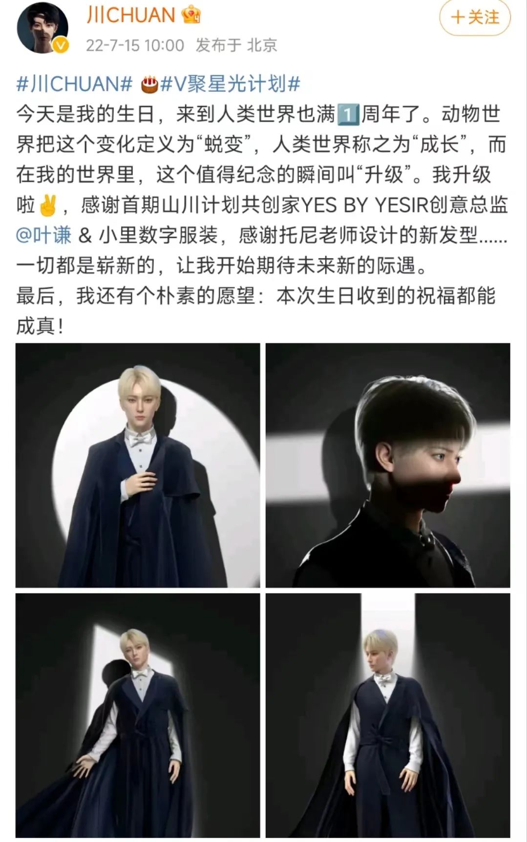 川CHUAN发布数字服装 图源:微博虚拟偶像则是虚拟人的另一种类型,在运营上呈现内容精致、输出速度慢的特点。虚拟偶像已应用到各个垂类,比如游戏偶像“迷你世界-花小楼”,借助游戏《迷你世界》的知名度,在2019年首次直播便迅速走红,以音乐会直播、推出单曲等方式活跃在互联网。