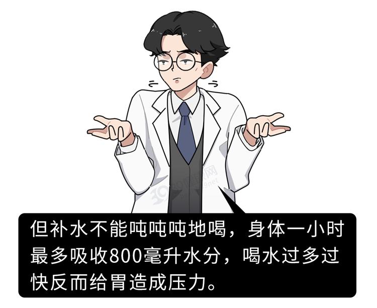 正确补水应以每次100-200毫升为度,大约3-4口(每小口约35毫升水),分批摄取。