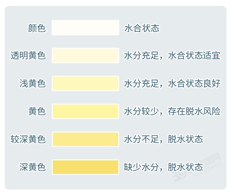 呈现较深黄色和深黄色时,提示人体水分不足或缺少水分,处于脱水状态。