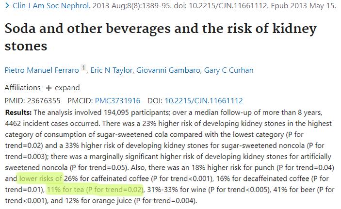虽然早在2013年,意大利一项针对19万人喝茶与肾结石发病率关系的调查发现:喝茶不仅没有增加肾结石的发病率,反而比最高发病率轻微地降低了11%。
