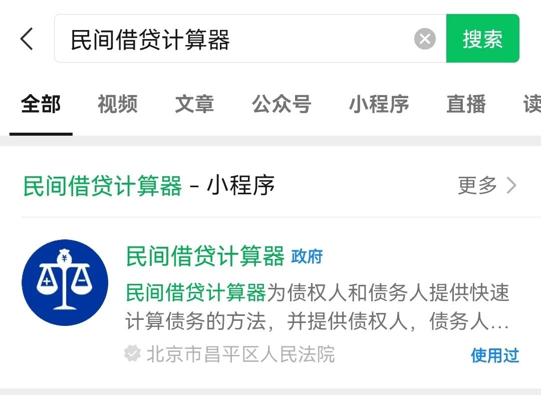 进入“民间借贷计算器”小程序,点击微信右上角,搜索 “民间借贷计算器”,进入小程序。