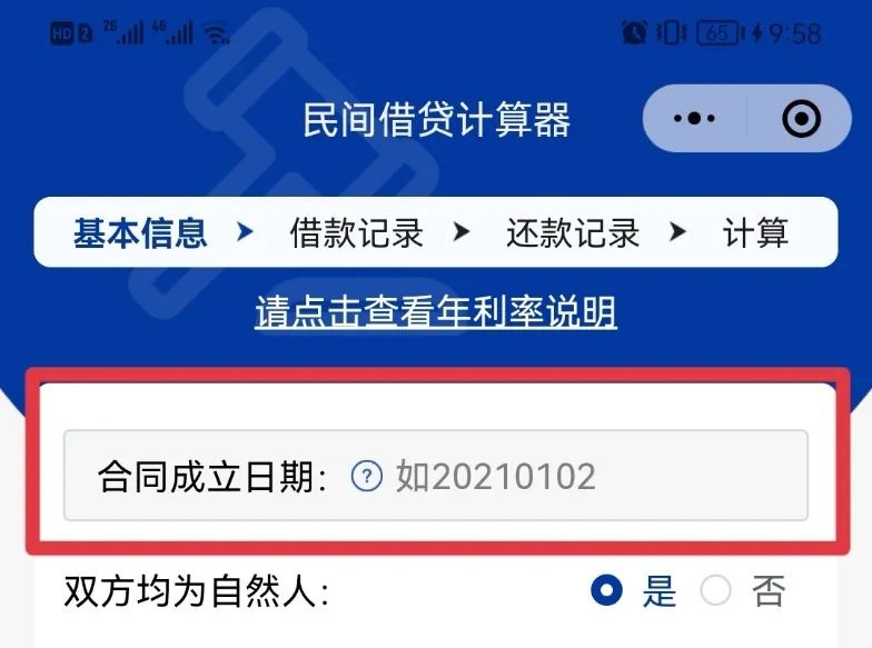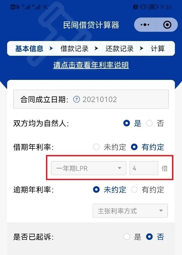 输入合同成立日期、双方是否均为自然人、借期年利率、逾期年利率、是否已起诉、添加借款记录、输入借款期限日期、添加还款记录、计算环节操作步骤同小程序端。