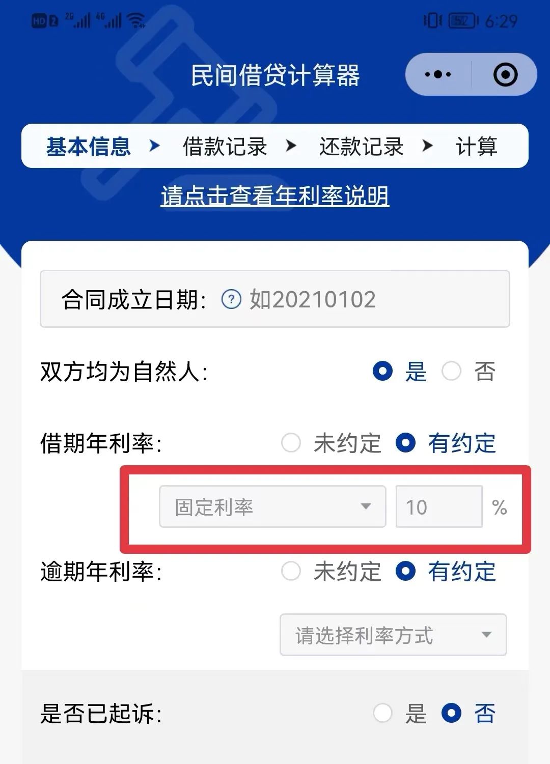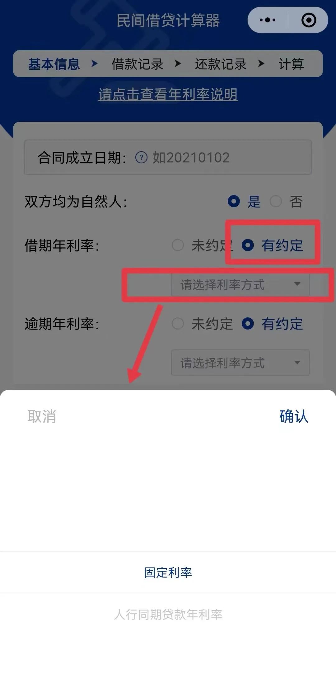 ▷如选择“固定利率”,在选项框后输入约定的借期(逾期)年利率(如双方约定借期内年利率为10%,则输入“10”);