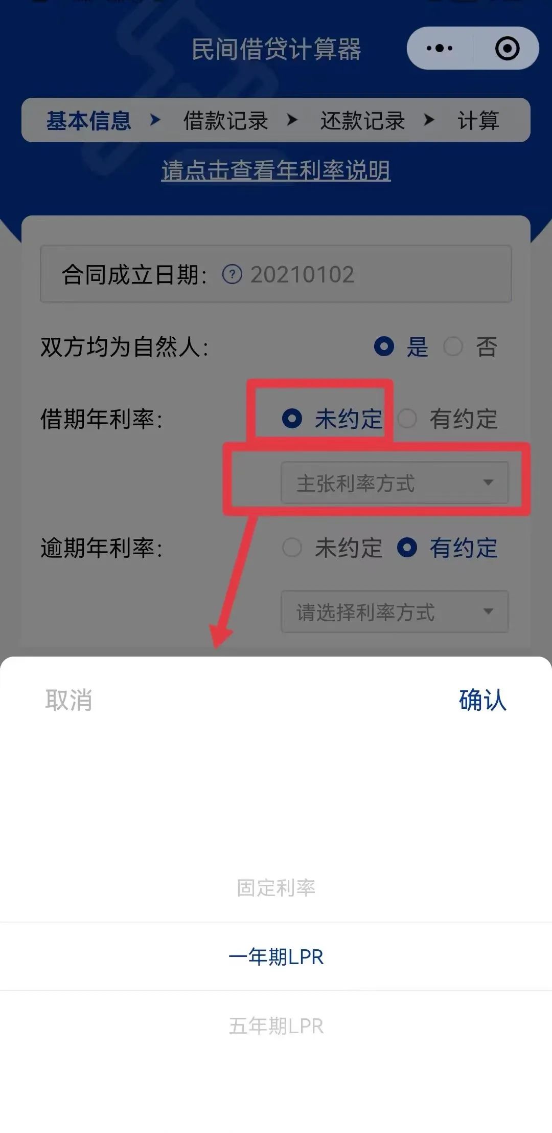 选择借期(逾期)年利率计算方式。如双方对借期(逾期)利率有约定,点击“有约定”,在相应下拉菜单中选择利率方式为“固定利率”或“人行同期贷款利率”或“一年期LPR”或“五年期LPR”,并点击“确认”。如双方对借期(逾期)利率没有约定,则点击“未约定”,在相应下拉菜单中选择本次起诉想要主张的利率方式,具体操作同点击“有约定”的情形。