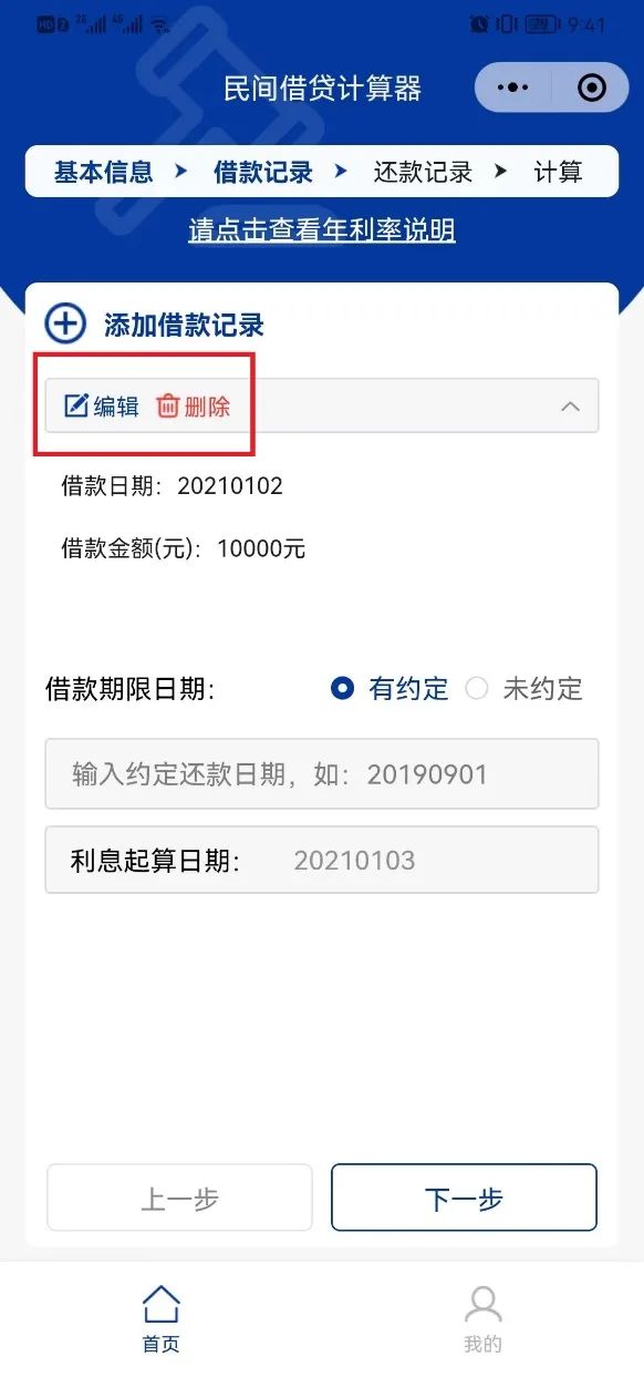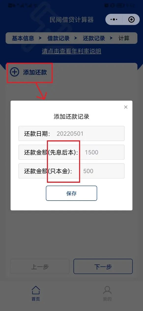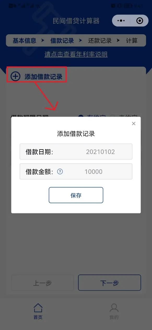 添加还款记录。点击“下一步”,进入还款记录页面,点击“添加还款记录”按钮,输入还款日期和还款金额(先息后本型和只还本金型分别填写),点击“保存”。可以通过重复点击“添加还款记录”按钮添加多笔还款,已经添加的点击该条还款记录可以进行编辑或者删除。