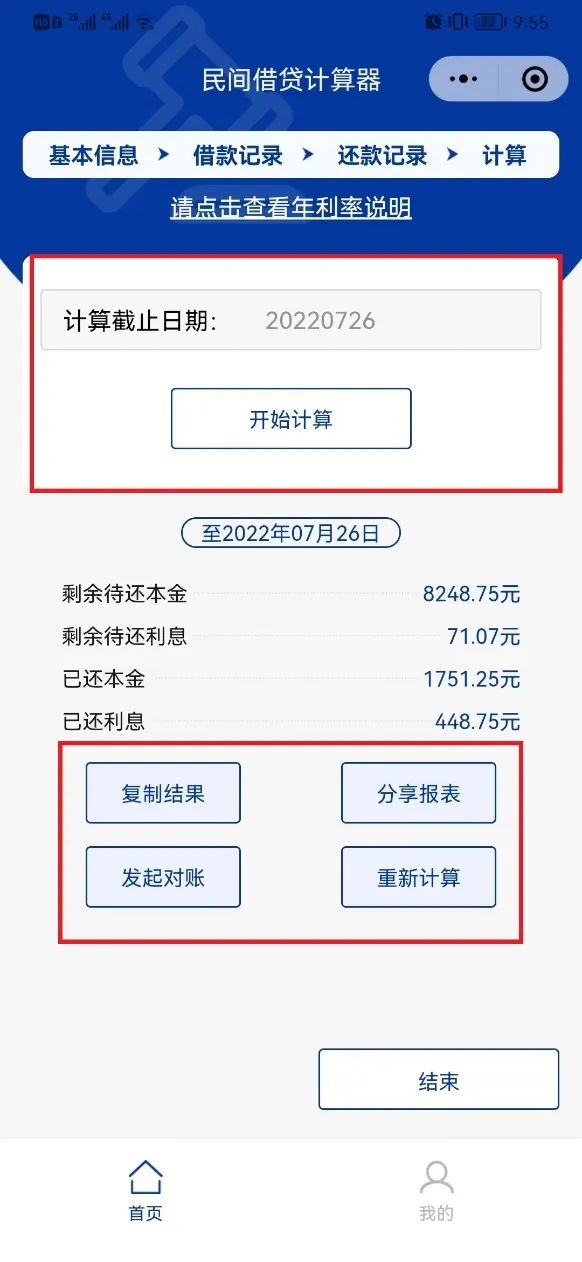 ▷结果计算。点击“下一步”,进入计算页面。填写计算截止日期后,点击“开始计算”即可显示计算结果。该结果支持复制、分享,点击“重新计算”将保留本次输入数据回到起始界面,点击“结束”将清空本次输入数据回到起始界面。08