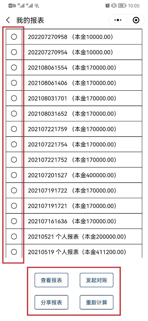 历史报表查询。点击页面下方的“我的”——“个人报表”,可查看、分享所有计算记录,点击“重新计算”可对原有数据进行编辑,重新进行计算。