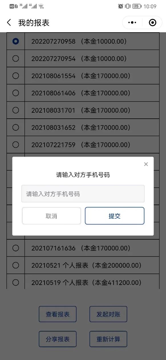 09对账功能。选择相应报表,点击“发起对账”按钮,输入对方手机号点击提交,对方同意后系统会自动生成对账报表。