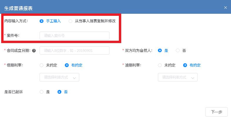当事人未提交计算的,点击“生成普通报表”,内容输入方式选择“手工输入”,并输入案件号。(当事人已提交计算的选择“从当事人报表复制并修改”,输入当事人手机号后可以直接调取该手机号在小程序端已经生成的报表进行直接修改,无需重复输入。)