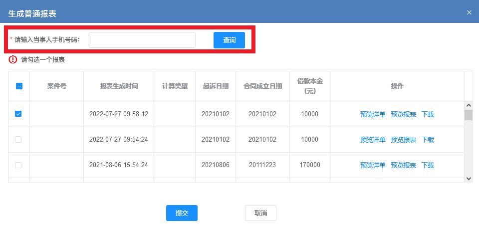 点击生成对账报表,输入债权人手机号和债务人手机号,点击提交,系统会自动生成对账报表。对账报表可当庭打印用于举证质证,使得双方有争议的部分一目了然,提升审判效率。