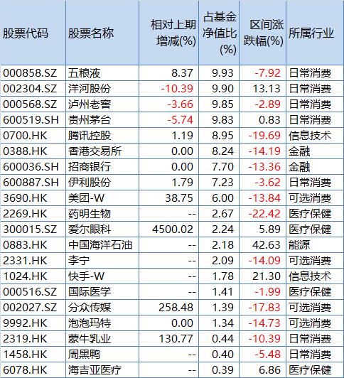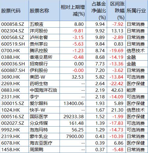 此外,爱尔眼科(300015.SZ)、快手-W(01024.HK)、国际医学(000516.SZ)、分众传媒(002027.SZ)、泡泡玛特(09992.HK)、蒙牛乳业(02319.HK)、海吉亚医疗(06078.HK)、周黑鸭(01458.HK)分列第13位至第20位重仓股。其中,快手、海吉亚医疗和周黑鸭都是首次入选该基金的股票池,其余个股都获得不同程度加仓。