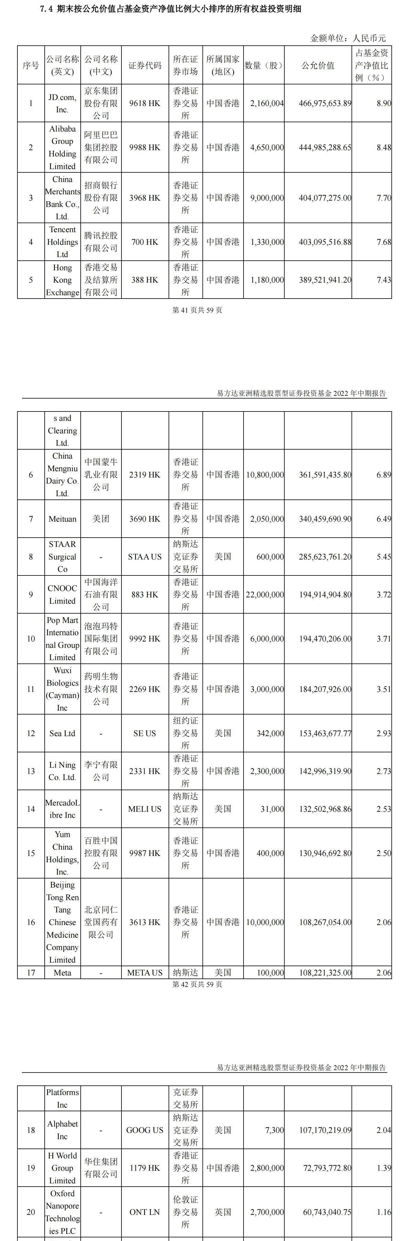 易方达亚洲精选还包括药明生物(02269.HK)、美股Sea Ltd、李宁、美股MercadoLibre Inc、百胜中国(09987.HK)、同仁堂国药(03613.HK)、美股Meta(脸书)、美股Alphabet Inc(谷歌)。