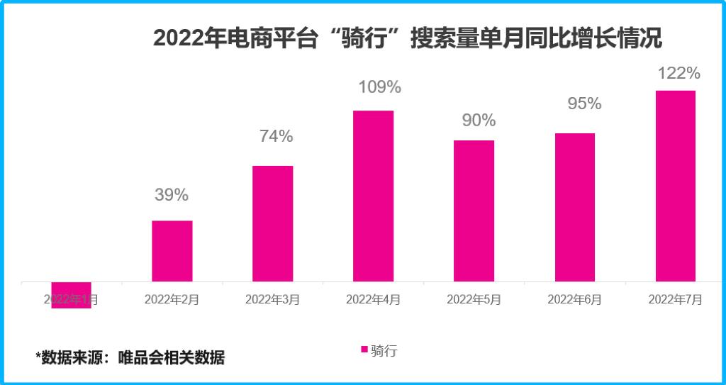 而在唯品会上,今年4月以来“骑行”的搜索量同比均保持着几乎翻倍的增长。成交方面,2022年以来,骑行配件的销量同比增长97%,自行车尤其是山地车的销量增长明显,同比涨幅达35%以上;同时,骑行服也是投身这项运动人们必备的装备之一,暑假期间骑行服销量同比增长47%;此外,骑行正在由个人运动向全家运动发展,2022年儿童自行车销量同比增长32%,其中来自90后的销量同比增长43%。