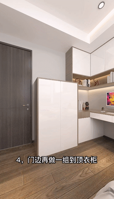 门边再做一排到顶的双开衣柜,储放一些当季常穿的衣物,拿取也很方便。