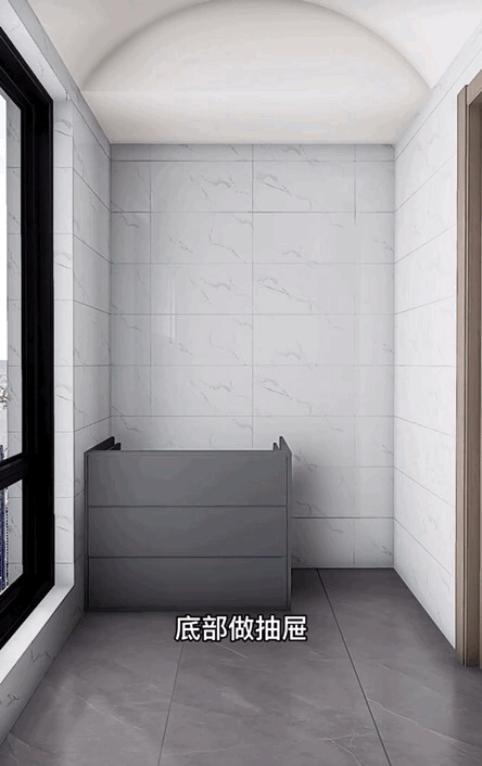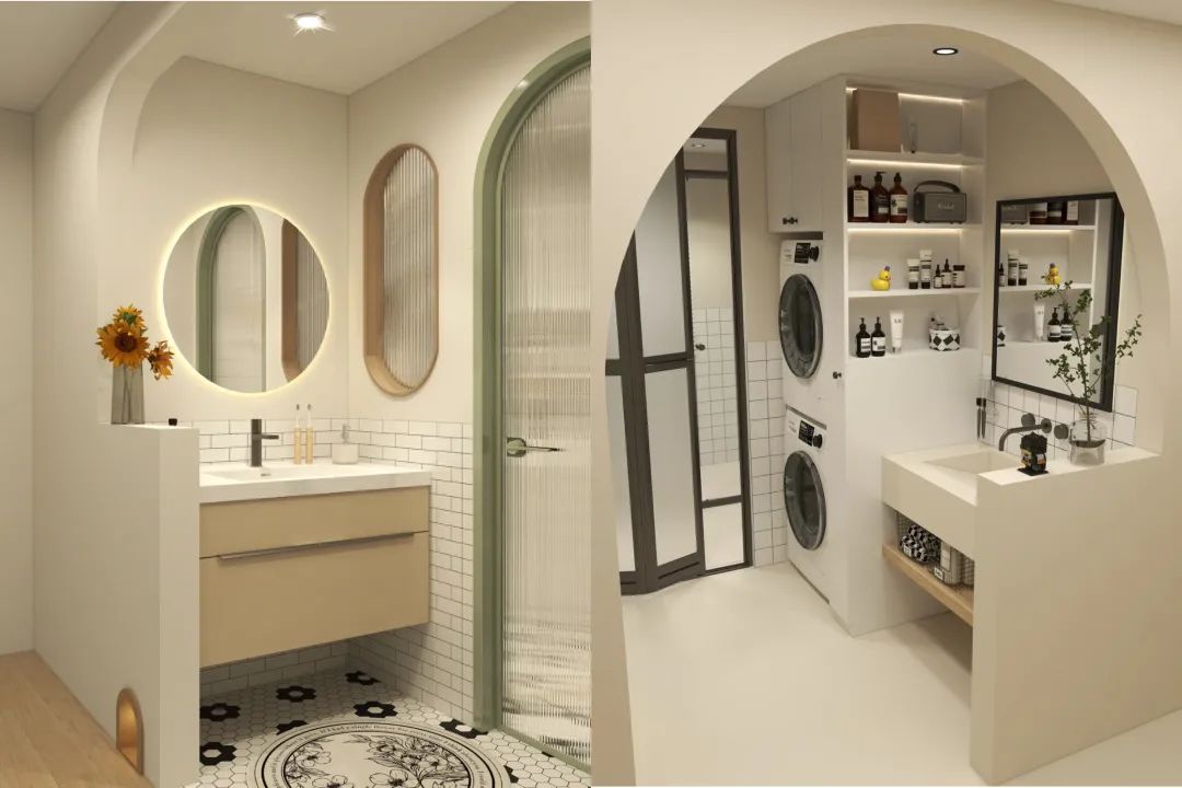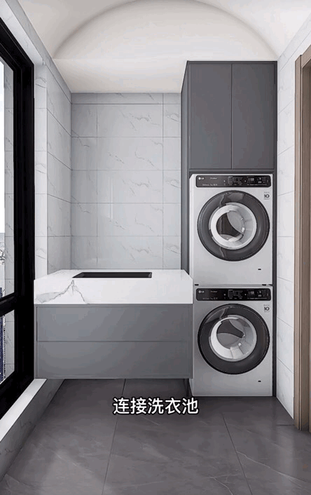 将洗衣机嵌入洗手台,整体看起来十分统一,也利于下水管道排布。