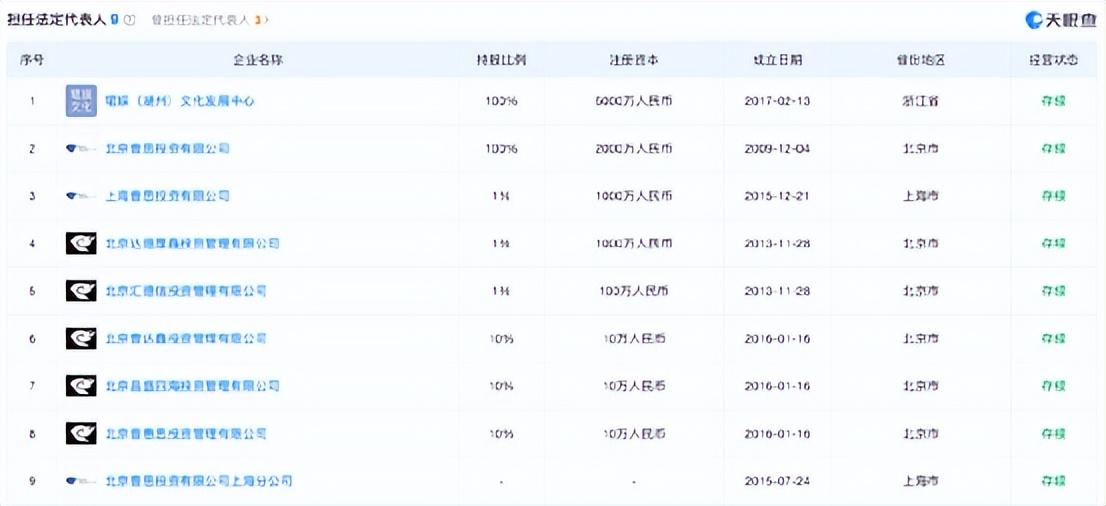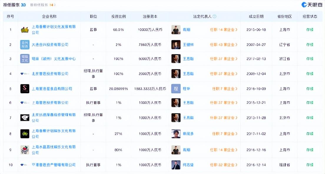 天眼查APP信息显示,目前王思聪关联企业共37家,其中存续状态的有26家,包括上海熊猫互娱文化有限公司、万达产业投资有限公司、大连合兴投资有限公司、珺娱(湖州)文化发展中心、北京普思投资有限公司等,涉及投资管理、科技、娱乐、影视、食品等行业。同时,王思聪任9家公司法定代表人,在16家公司中担任董事长、董事、监事等管理职位,并在24家公司中持有股份,拥有上百家公司的实际控制权。