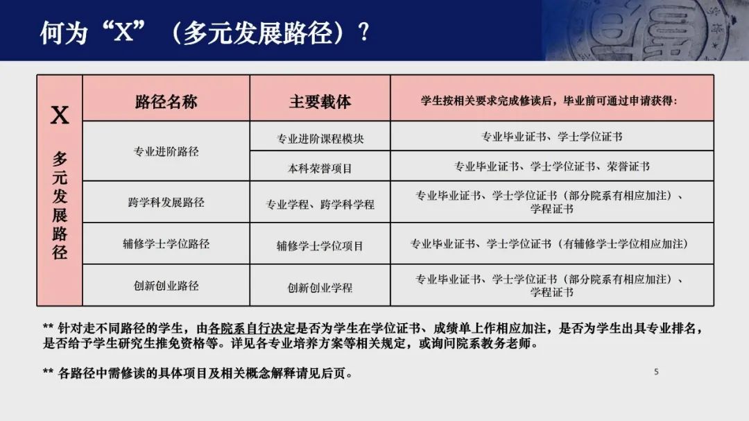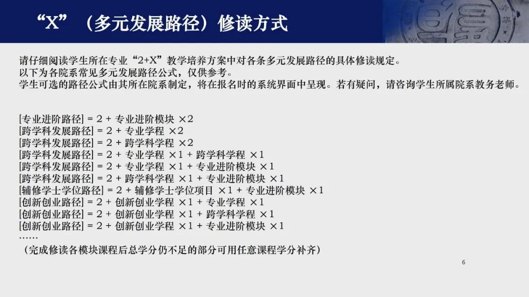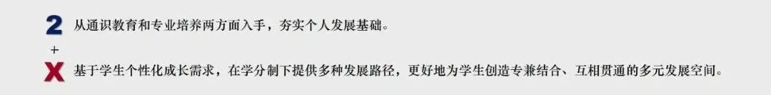 | 2+X的官方介绍,来自教务处2022年答疑PPT通俗易懂地解释“2+X”体系,就是把原本的“辅修制”、“二专制”替换成了“学程制”。学程是二专的浓缩版,原本需要额外修读的40-60分的二专课,被换成了15-20分的学程课程,或是40分的辅修学士学位课程。与二专最大的不同就是,学程内的课程都是各个院系开设的专业课,而不是额外针对外专业学生开设的二专课程。选择跨学科的学生,需要和外院系的学生一起上必修、选修课,颇有“流浪校园”的色彩。