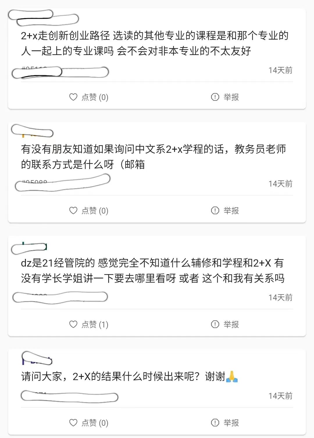 20级的一零在2022年的“2+X”报名前夕,被朋友拉进了自发组织的学程交流群,她发现,群里的同学们大多比较迷茫,因为没有统一的规范告诉他们,学程报名有什么限制,什么时候可以正式选择发展路径,诸如此类的问题。群里的同学集中在大二和大三,都处在想尝试而未开始的阶段。