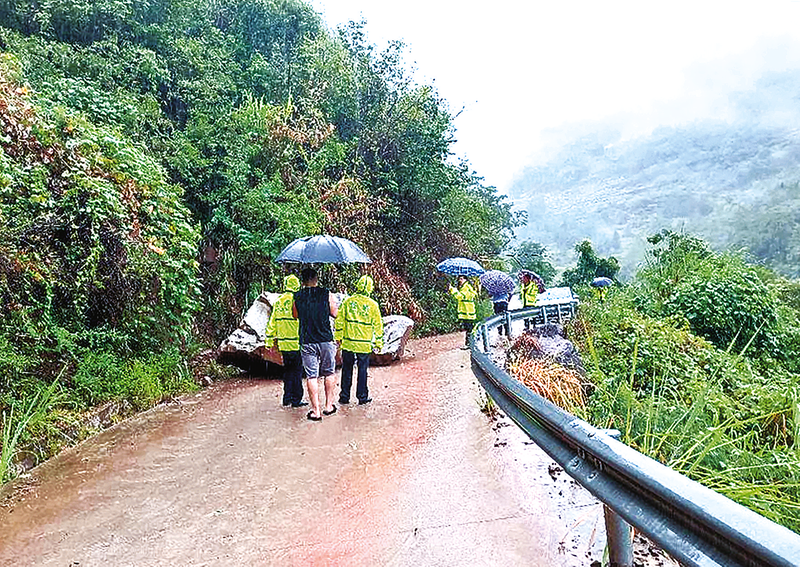 查看落石阻断道路情况 记者 张鑫坪 摄(记者 程超 李菱 张鑫坪 谢国邦 见习记者 龙俊亦 通讯员 廖中顺 肖朝松 李晶星 刘文)8月29日晚至30日,我区出现强降雨天气。我区各部门单位、乡镇街道始终坚持“人民至上、生命至上”理念,迅速启动防汛应急预案,抓巡查,堵漏洞,排隐患,化风险,切实做好旱涝急转防灾救灾各项工作,确保人民群众生命财产安全。