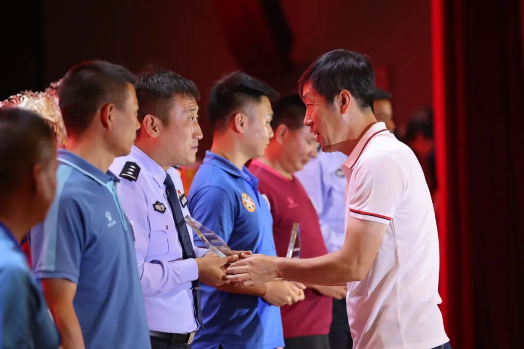 在8月29日举行的颁奖仪式上,中国男子足球国家队前主教练高洪波为公安支教民警颁发“优秀教练员”。张铮 摄