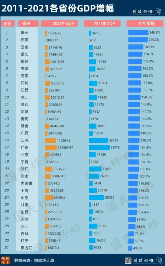 简单来看,过去10年,进步最快的非贵州莫属,经济位次从倒数第5名晋级到第22名,连升4名。在贵州之外,福建、安徽、重庆、云南都上升了3位,福建更是得以跻身TOP10经济大省之列。