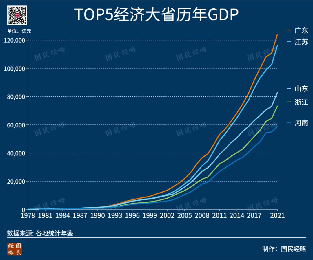 其中,广东、江苏10年经济增幅基本与大盘持平,而浙江、河南、山东则跑输大盘。