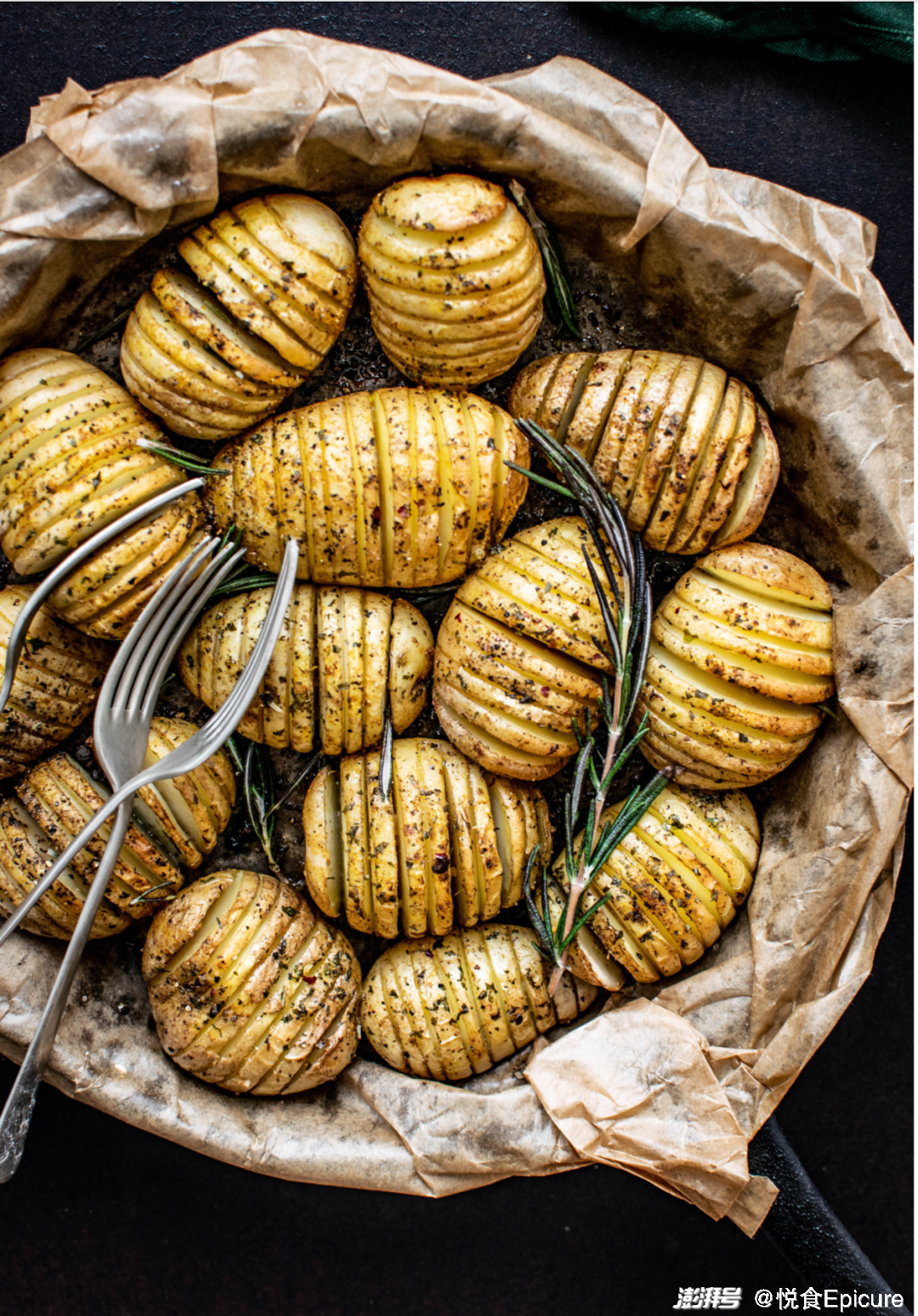 烤土豆也常见,和表皮光滑白净、煮熟即食的小土豆不同,做烤土豆的大土豆通常有两个成人拳头那么大,表皮粗糙许多,烤的时候也不去皮,追求的就是那点凛冽的泥土气息。北欧烤土豆是道考验刀功的菜,咱们有炫技的蓑衣黄瓜,人家就有花哨的风琴烤土豆。一只大土豆切薄片但不断开,像小小的手风琴般开出一朵漂亮的形状。浸泡着种香料和盐巴的橄榄油厚厚地抹在薄片之间,经火一烤香气极为诱人。